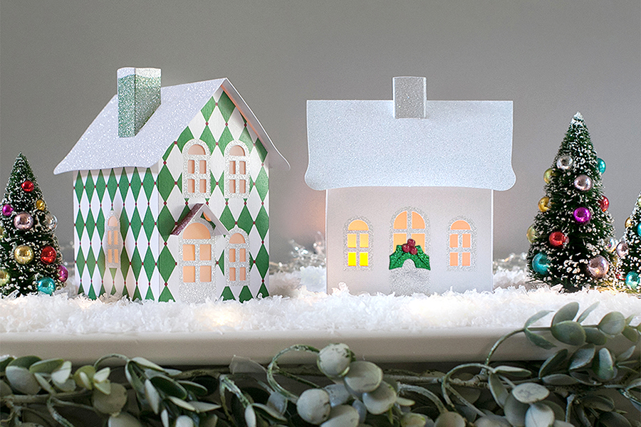 Add a touch of whimsy to your holiday village collection with these pop-up holiday houses. Set includes 2 houses crafted from beautiful Italian metallic card stock with white “no shed” glitter. White cottage has holly berry embellishment.
