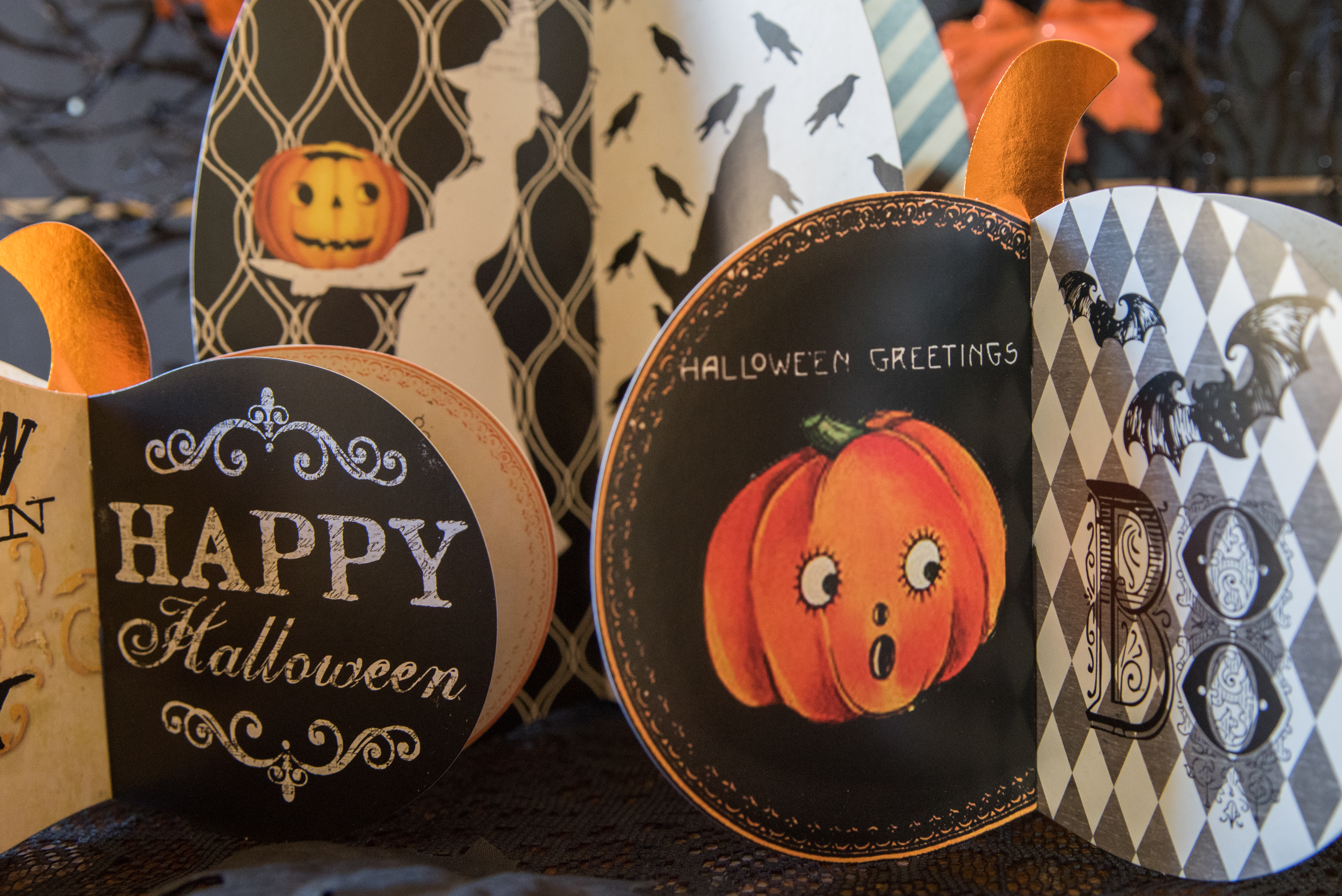Made of high quality American card stock & printed with delightful vintage images front & back. 360˚ view. Front side of pumpkins feature orange foil stems. Back side of stem is printed black.